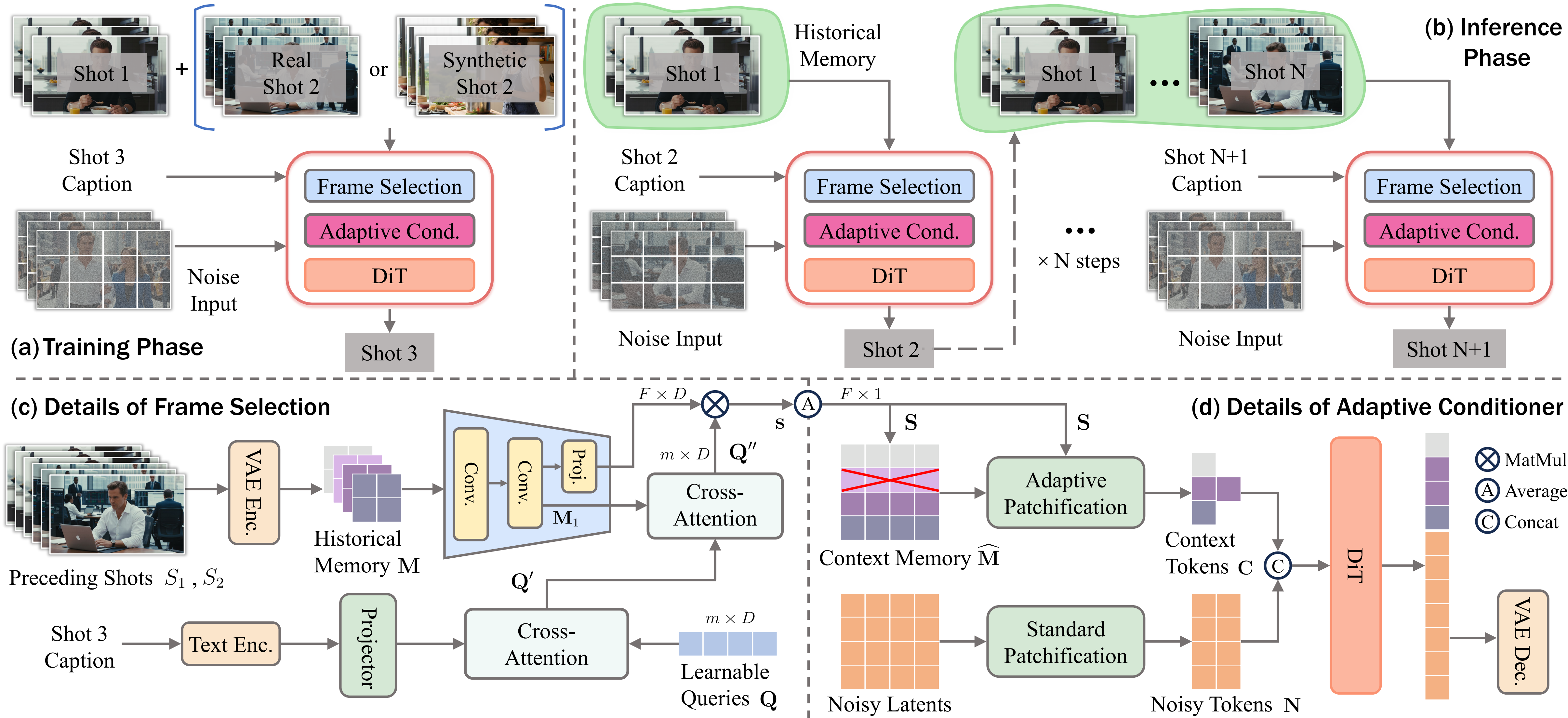 Our model reframes multi-shot video generation (MSV) as a next-shot generation task. (a) During training, the model learns to generate the final shot conditioned on the preceding two; when only two shots are available, we inflate with a synthetic shot to enable unified three-shot training. (b) At inference, it maintains a memory bank of past shots and generates multi-shot videos autoregressively. The model is comprised of two key components: (c) a Frame Selection module that selects semantically-relevant frames from preceding shots to construct a global context, and (d) an Adaptive Conditioner that dynamically compresses the selected context and injects it directly into the generator for efficient conditioning. Together, OneStory realizes adaptive memory modeling, enabling global yet compact cross-shot context for coherent narrative generation.