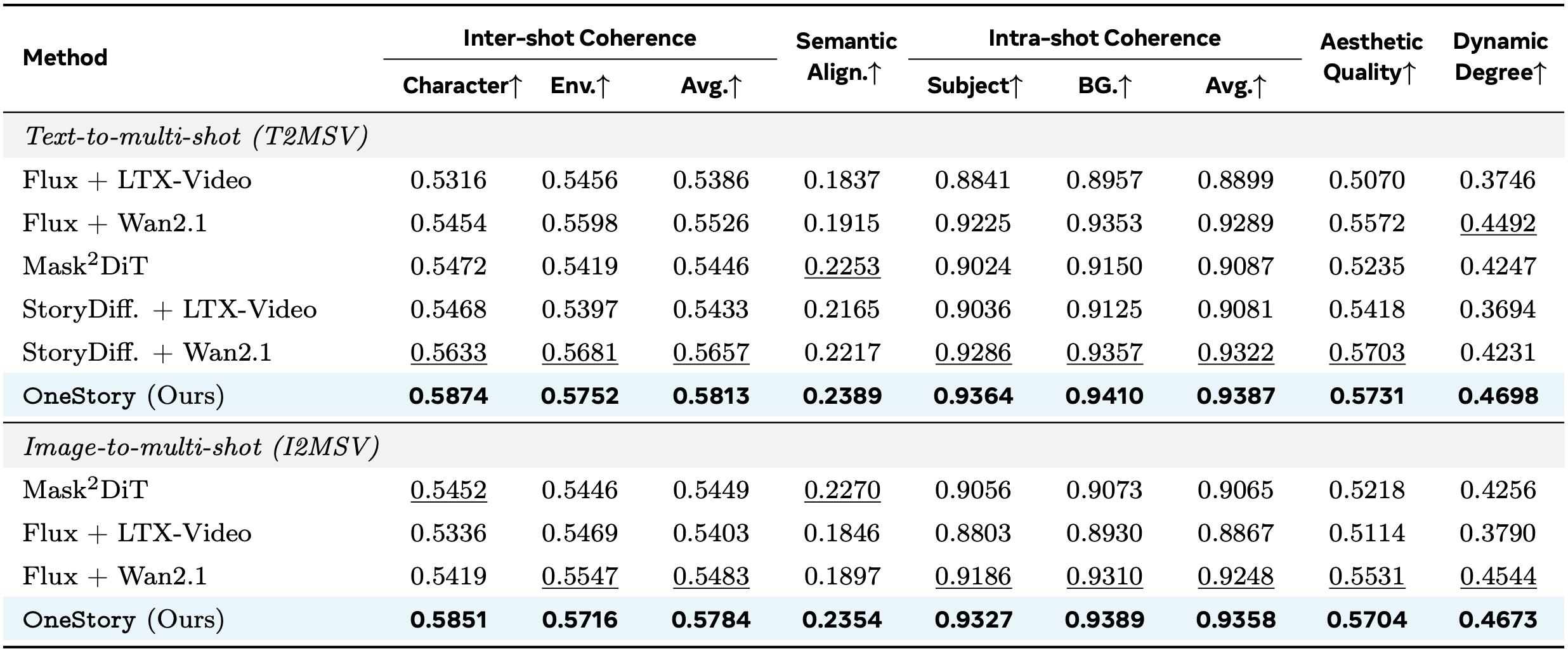 Quantitative results under text-to-multi-shot (T2MSV) and image-to-multi-shot (I2MSV) settings. The best and runner-up results are in bold and underlined, respectively. In both text- and image-conditioned settings, our model consistently outperforms all baselines on shot-level quality and narrative consistency, demonstrating superior multi-shot generation capabilities. Env. denotes environment consistency, BG. denotes background consistency, and Avg. indicates the average of the corresponding metrics.